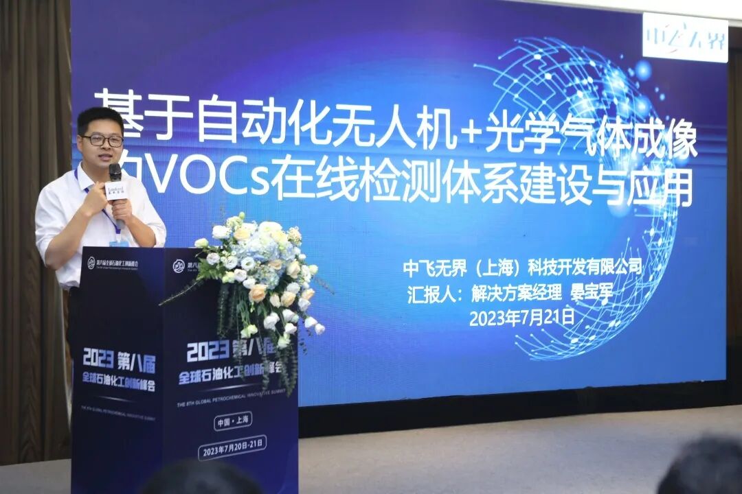 中飞无界(上海)科技开发有限公司晏宝军经理带来了《基于自动化无人机+光学气体成像的VOCs在线检测体系建设与应用》的分享,指出近年来无人机市场和消防化工行业的合作进展,强调无人机的自动化巡检及快速定位,实现无人化操作,减少了人员操作的复杂性和不稳定性,快速实现与消防部门的报警联动。