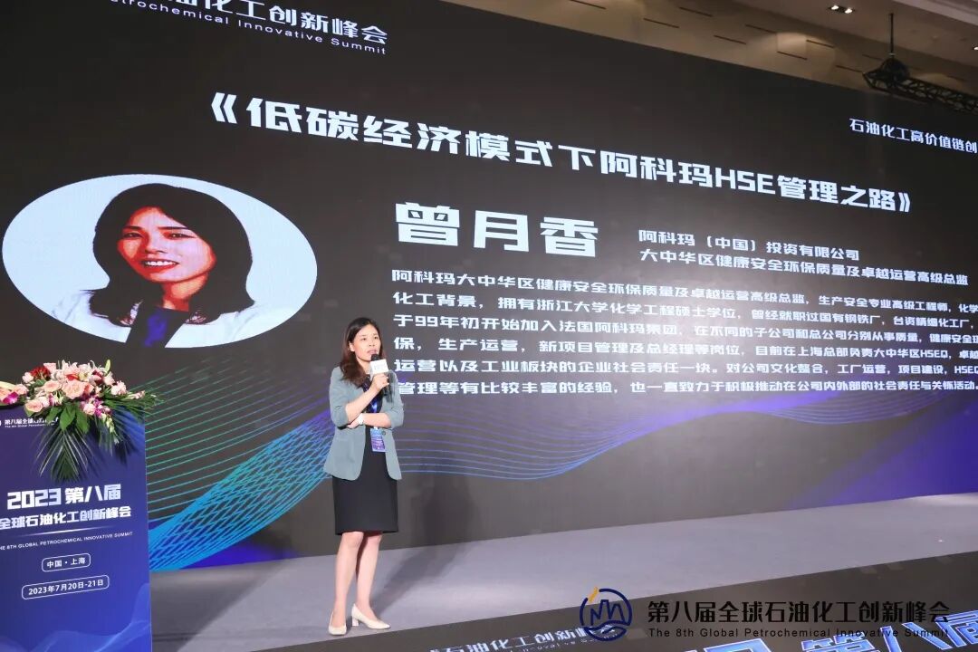 阿科玛(中国)投资有限公司大中华区健康安全环保质量及卓越运营高级总监曾月香女士,分享了《低碳经济模式下,阿科玛HSE管理之路》,指出阿科玛正积极改革,对项目进行全周期管理,从选址时考虑生态影响和可持续性,强调CSR社会责任的评审,确保降低环境足迹,通过全员参与和各项措施的推行,积极实现可持续发展目标。