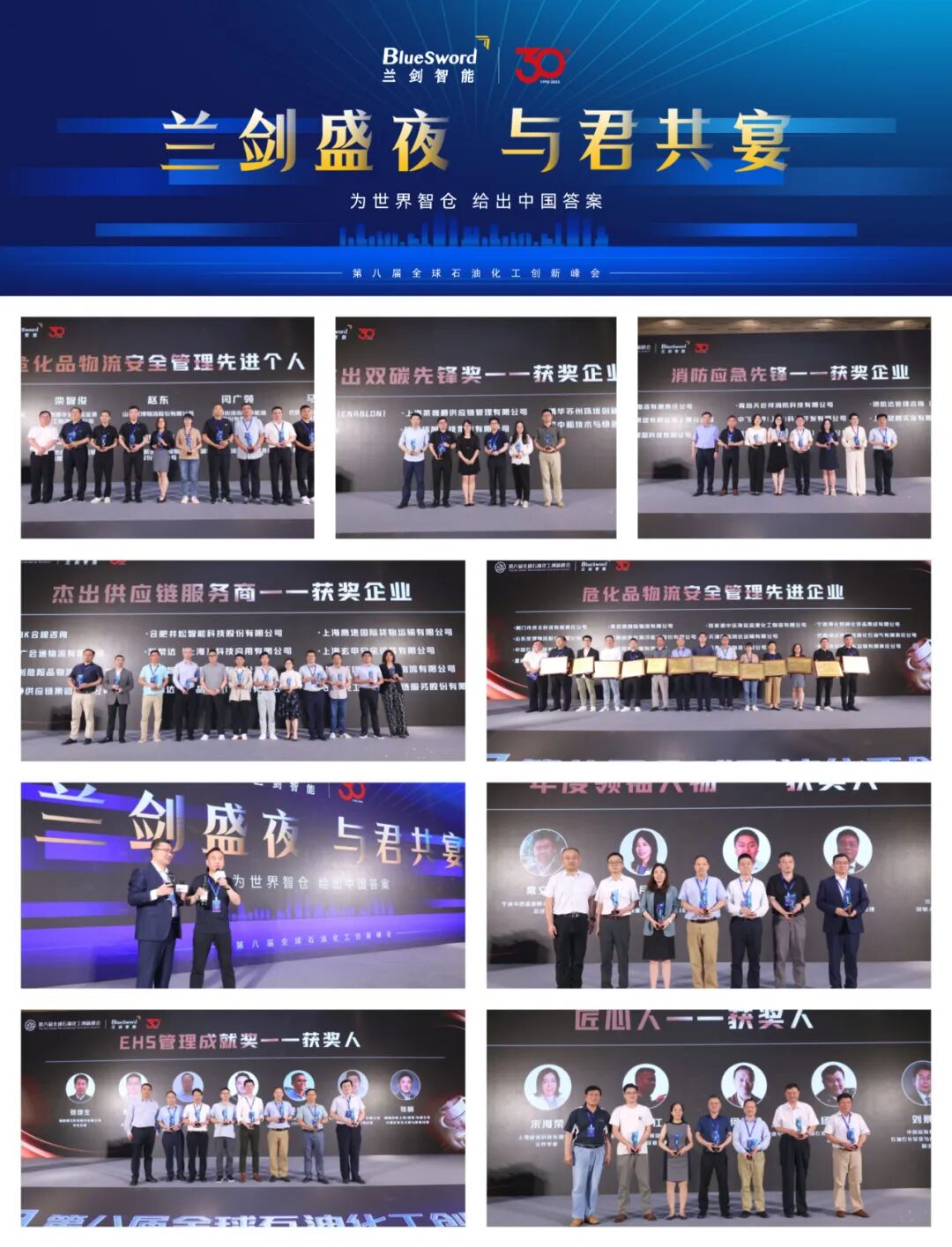 7月20日晚,旨在感谢石化领域标杆,传播榜样力量,传递匠心价值,将石化美好品质最大程度辐射到行业每个角落,在“兰剑盛夜”晚宴期间,特别设置“荣誉堂”,以赞扬与褒奖这一份经年累月的付出。分别颁发了“匠心人”、“年度领袖人物”、“EHS管理成就奖”、“碳先锋奖”、“杰出供应链服务商”、“消防应急先锋奖”,“危化品物流安全管理先进企业&个人”等奖项。